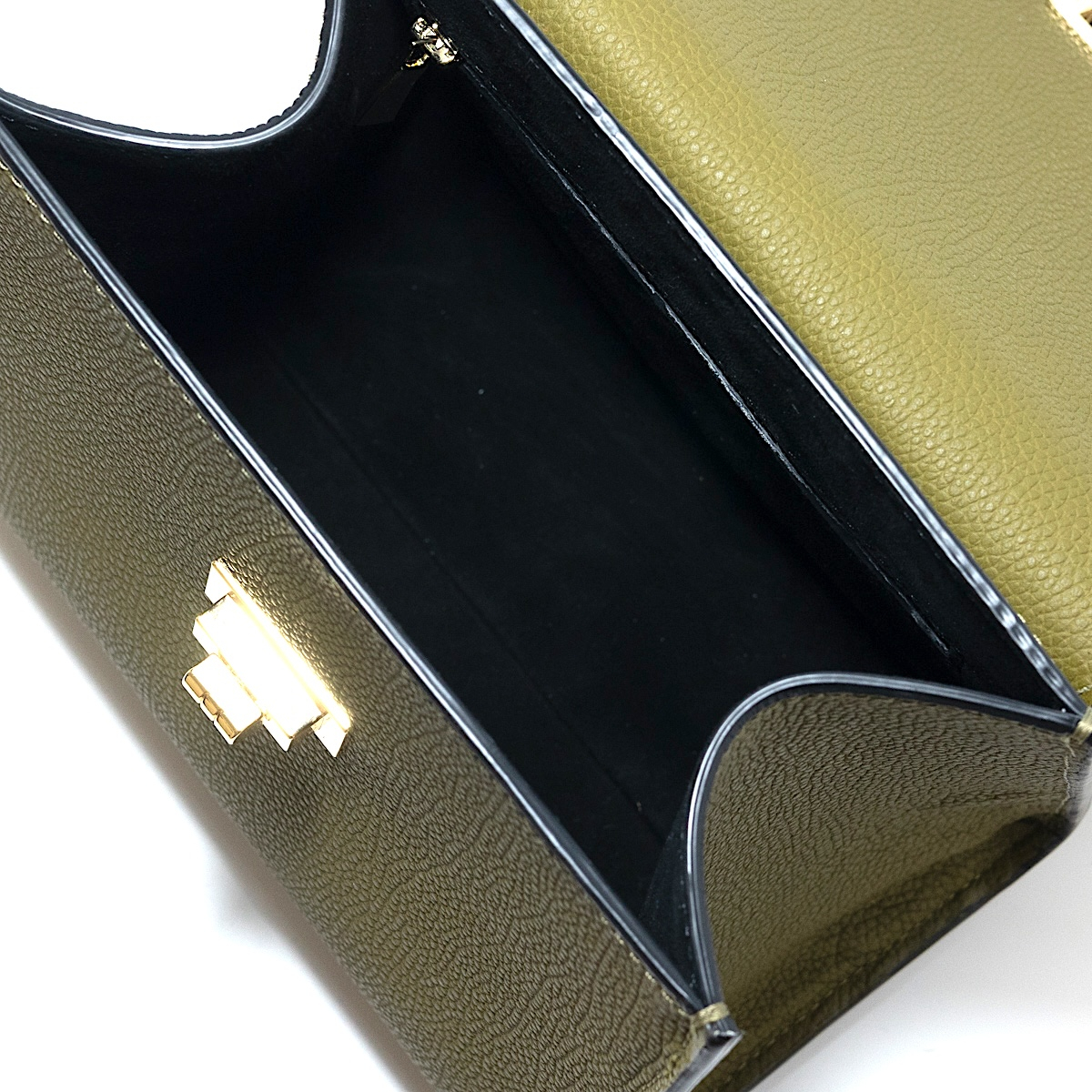 Geanta LILI Verde Olive Impression din piele naturală este definiția echilibrului perfect între o formă clară și o funcționalitate discretă. Cu o structură rigidă și o siluetă geometrică impecabil definită, acest accesoriu este o piesă practică, dar profund sofisticată, creată pentru femeia care aspiră la eleganță fără efort.